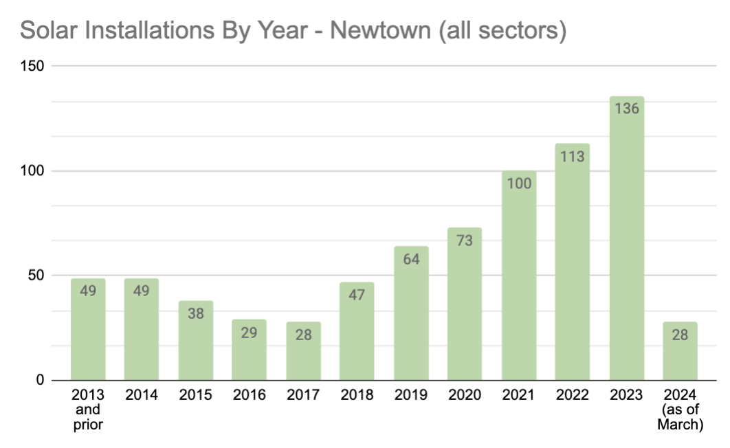 As of early 2023, over 84% of all electricity for Newtown’s municipal buildings come from solar energy. Collectively, there are 754+ municipal, commercial/industrial, and residential individual solar sites in Newtown. These sites generate over 10 megawatts (MW) of energy.